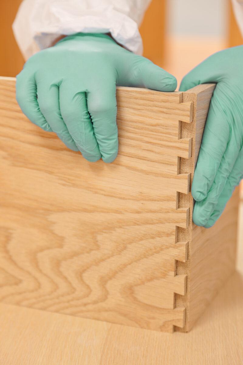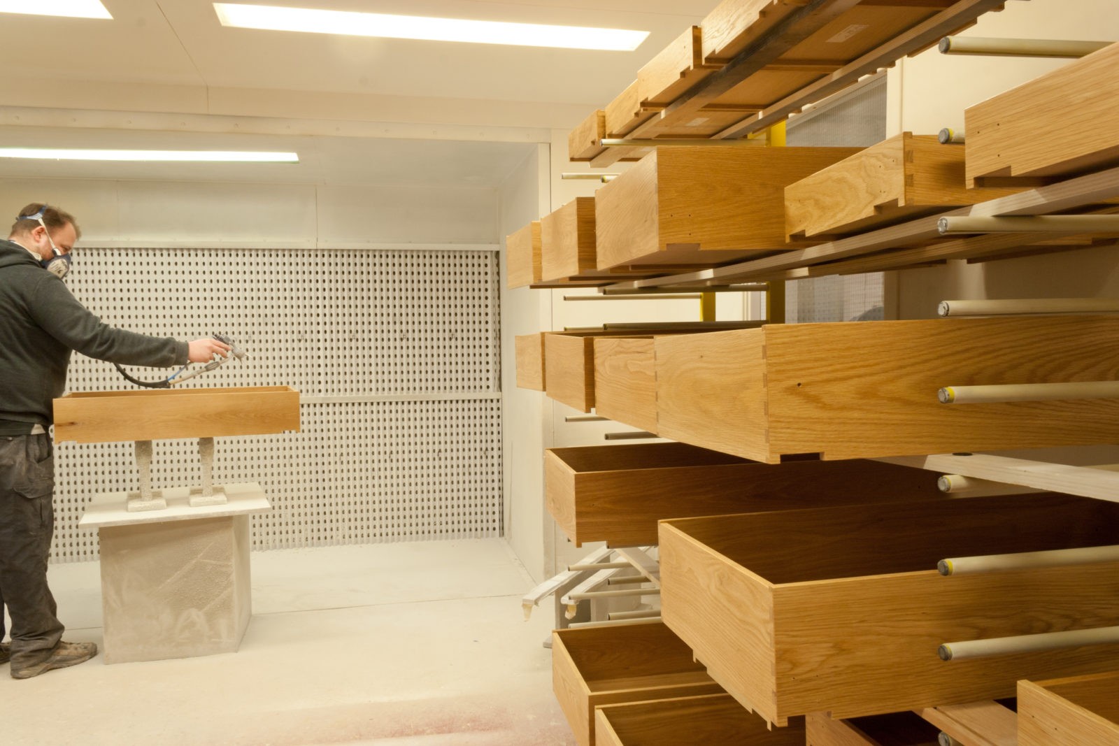 There should never be any drips or lines on a lacquered box – it should always be a smooth finish. We use two coats of child-safe lacquer to protect the wood for drawer boxes, de-nibbing between each coat, giving an even sheen to the overall finish of your drawer box.